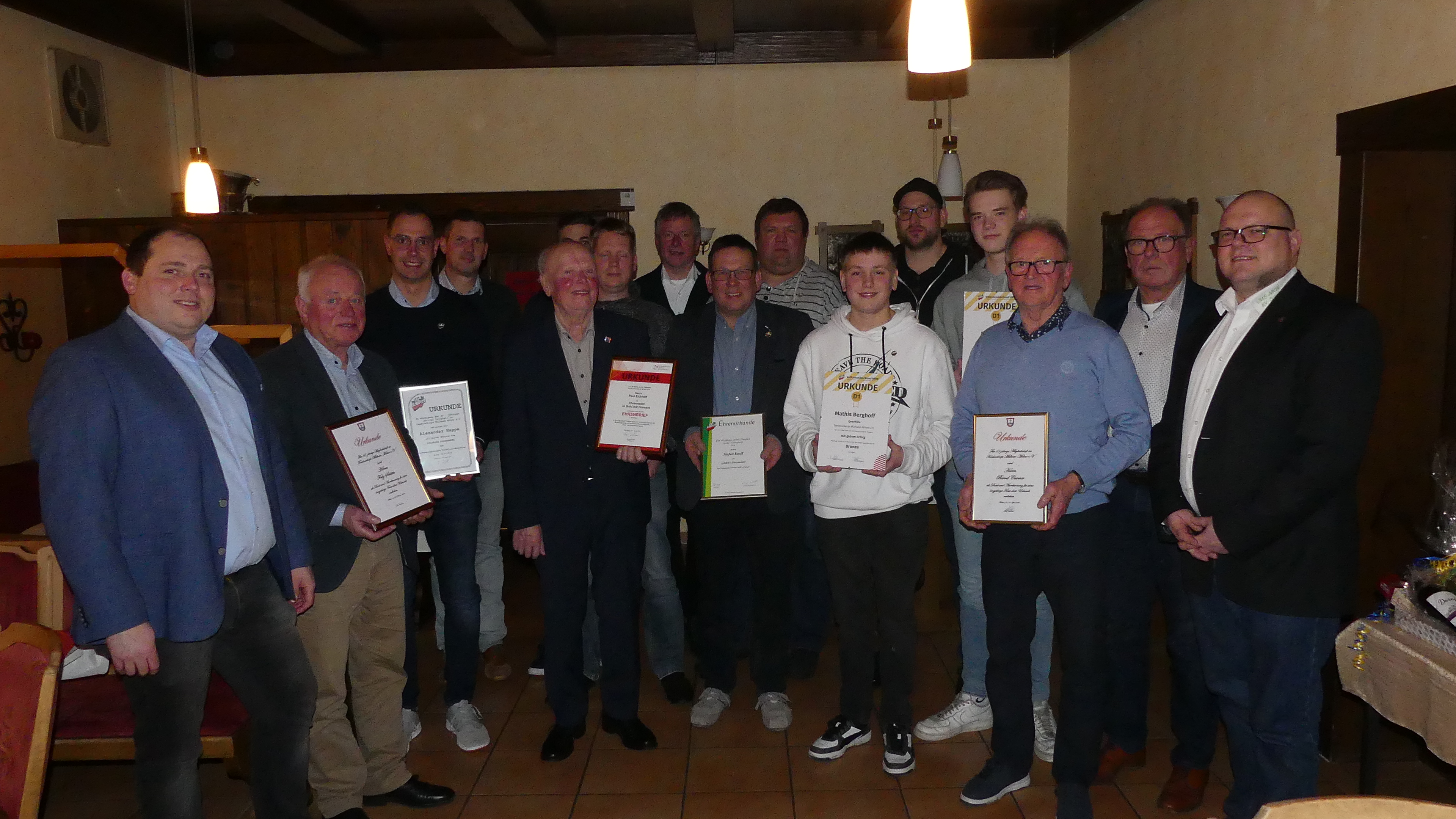 Nach einer Laudatio auf das langjährige Mitglied Paul Eickhoff ließ Koch eben diesen nach vorne bitten. Koch und der erste Vorsitzende des Volksmusikerbundes des Kreisverbandes Soest, Frank Steffens, gratulierten Paul Eickhoff für die inzwischen 71-jährige Mitgliedschaft und bedankten sich für die Treue zum Verein. Im Anschluss wurden Fritz Schütte für 65 Jahre sowie Bernd Cramer und Gerd Eickhoff für 55 Jahre, Stefan Korff für 40 Jahre, Frank Mester für 25 Jahre sowie Alexander Happe und Thomas Wirth für 20 Jahre Mitgliedschaft geehrt. Nach den Ehrungen für langjährige Mitgliedschaft zeichnete Christoph Koch die Mitglieder Mathis Berghoff und Paul Cordes noch für ihren bestandenen D1-Lehrgang im vergangenen Jahr mit einer Urkunde und Nadel aus.